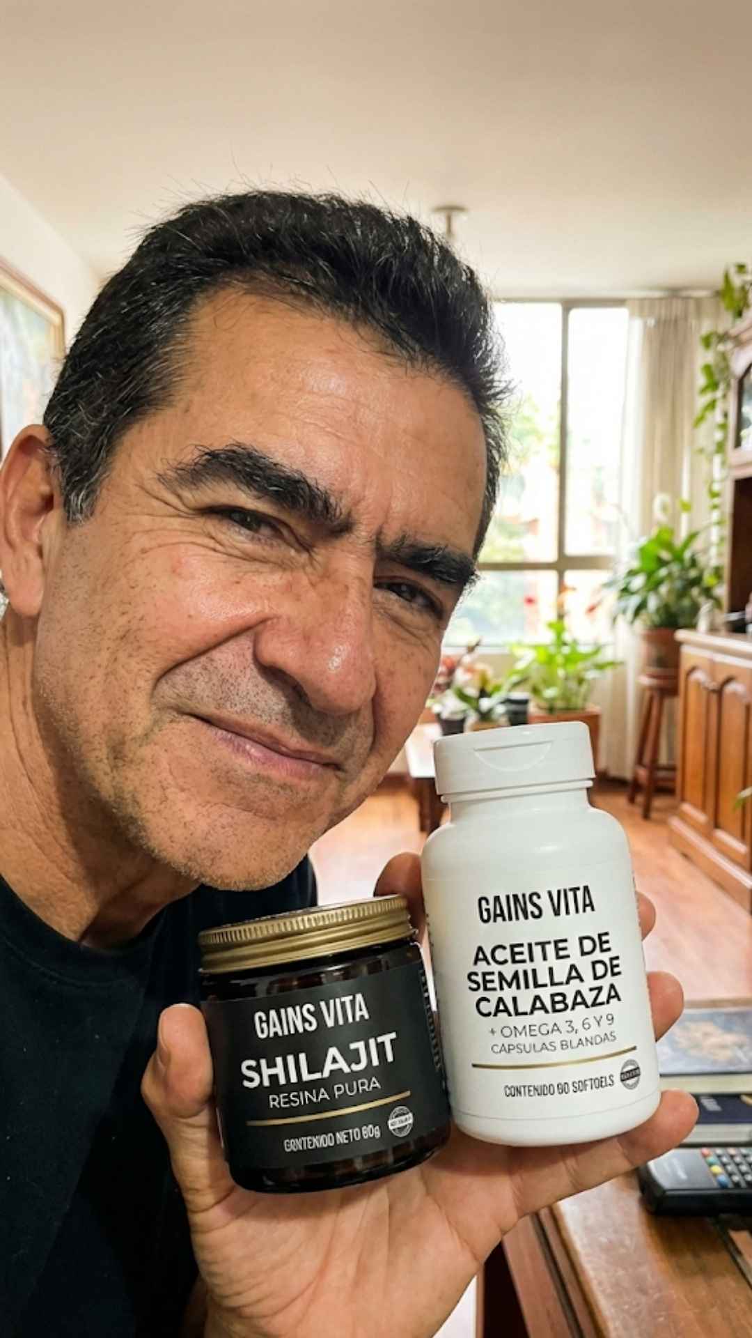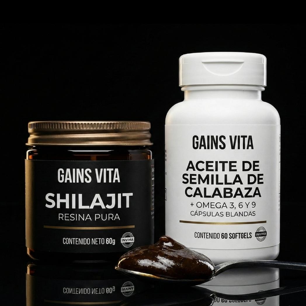 GAINS VITA es un combo completo de dos suplementos premium en uno: Shilajit Resina Pura de alta concentración y Aceite de Semilla de Calabaza + Omega 3, 6 y 9, ambos con Registro INVIMA certificado. Si compraras cada uno por separado en otras marcas de calidad equivalente, pagarías considerablemente más.