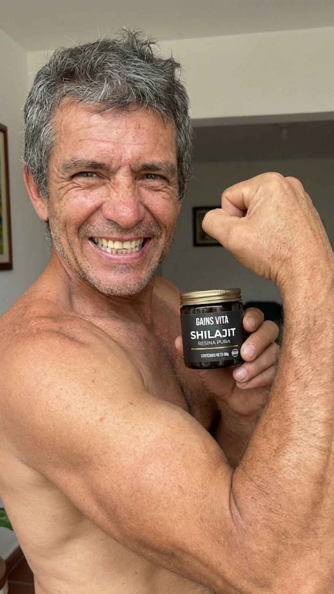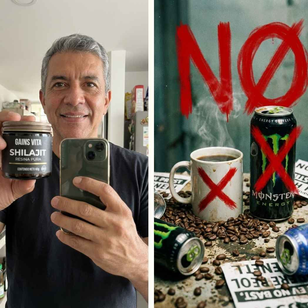 GAINS VITA funciona de forma completamente diferente. El Shilajit no estimula artificialmente tu cuerpo, lo nutre a nivel celular. Aumenta la producción natural de ATP (la energía real de tus células), optimiza tus niveles hormonales y mejora tu recuperación desde adentro. La energía que sientes no es un pico seguido de un bajón, es sostenida, real y acumulativa.