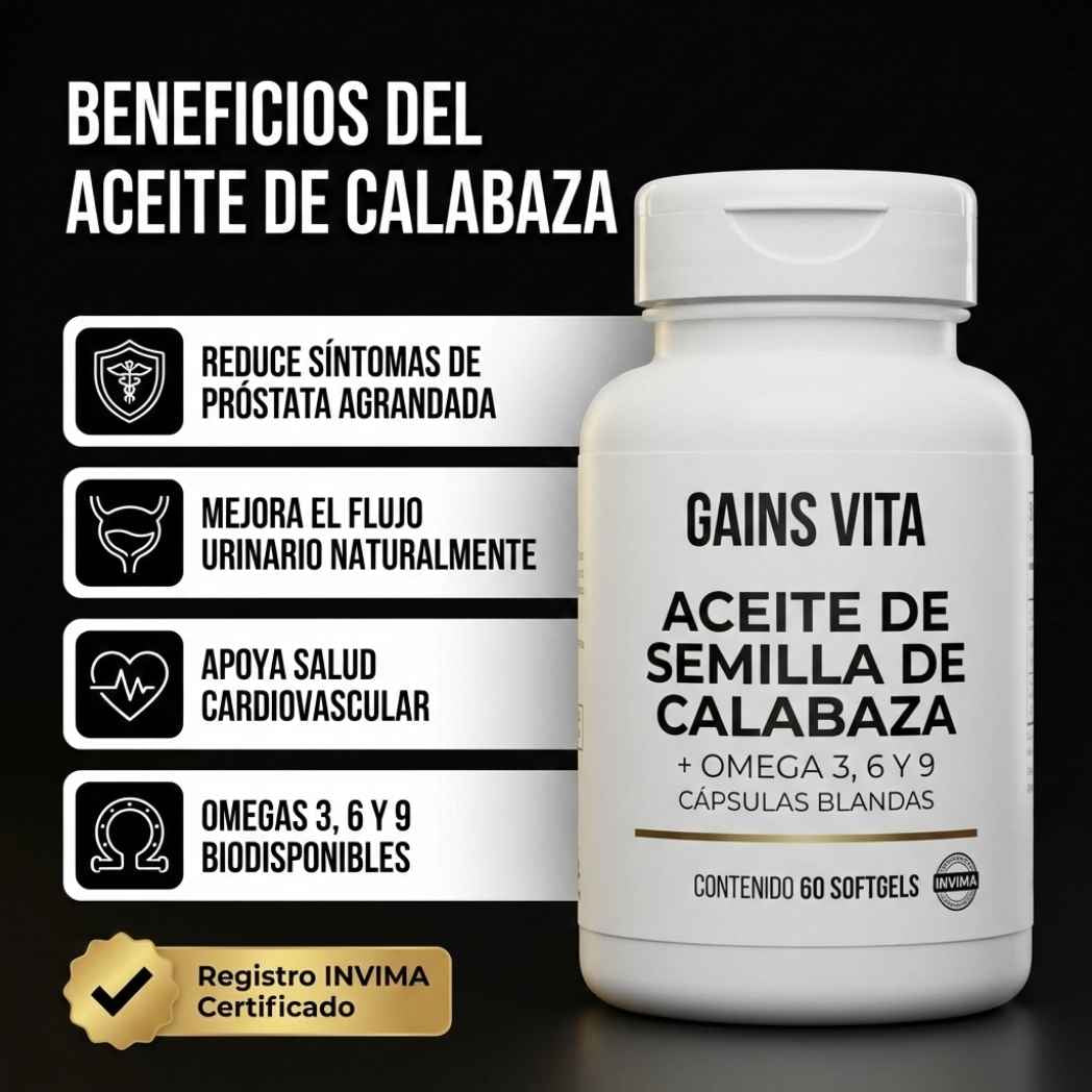 El Aceite de Semilla de Calabaza de GAINS VITA es la solución natural, certificada y respaldada por la ciencia que tu cuerpo necesita. Rico en Omegas 3, 6 y 9, fitoesteroles y zinc, actúa directamente donde más importa: tu próstata, tu vejiga y tu corazón.